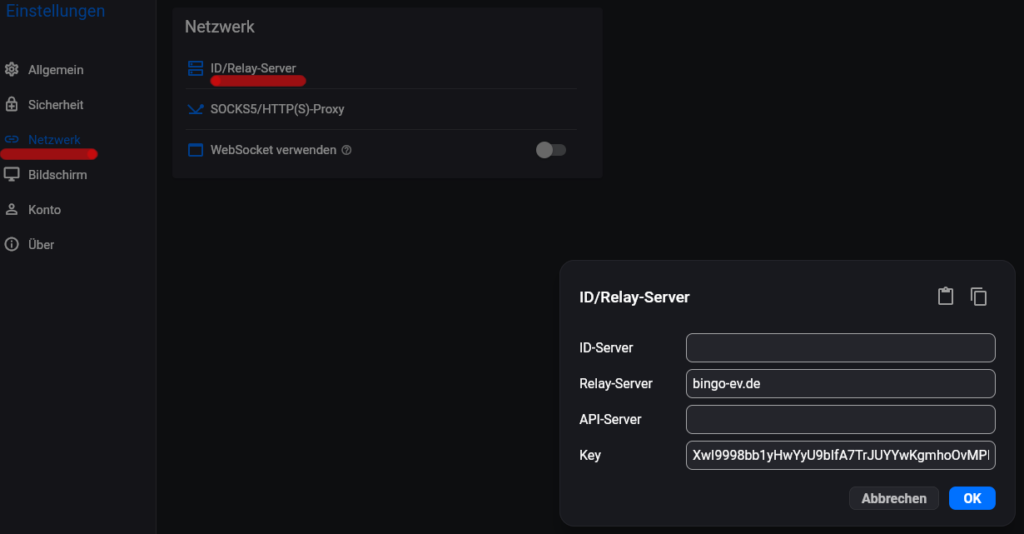 Netzwerk -> ID/Relay-Server hier folgende Daten eintragen: